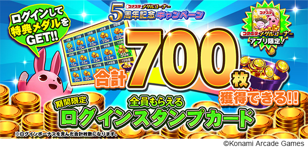 期間中は、KONAMI ID連携で毎日メダル30枚、ログインスタンプカードで最大700枚のメダルを獲得できます。