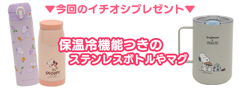 ステンレスボトル、マグカップ、バッグ、お財布など実用的なグッズが当たるチャンス。