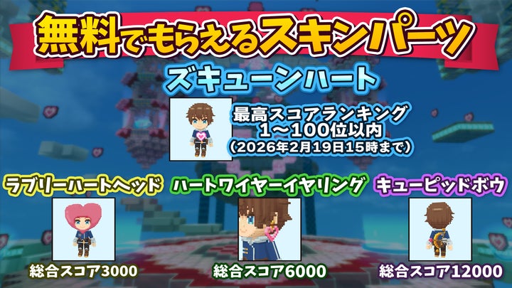 - 期間限定ミニゲームワールド「キューピッドハート」が登場し、射的ゲームで限定スキンなどを獲得可能。