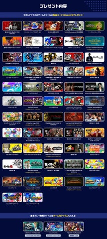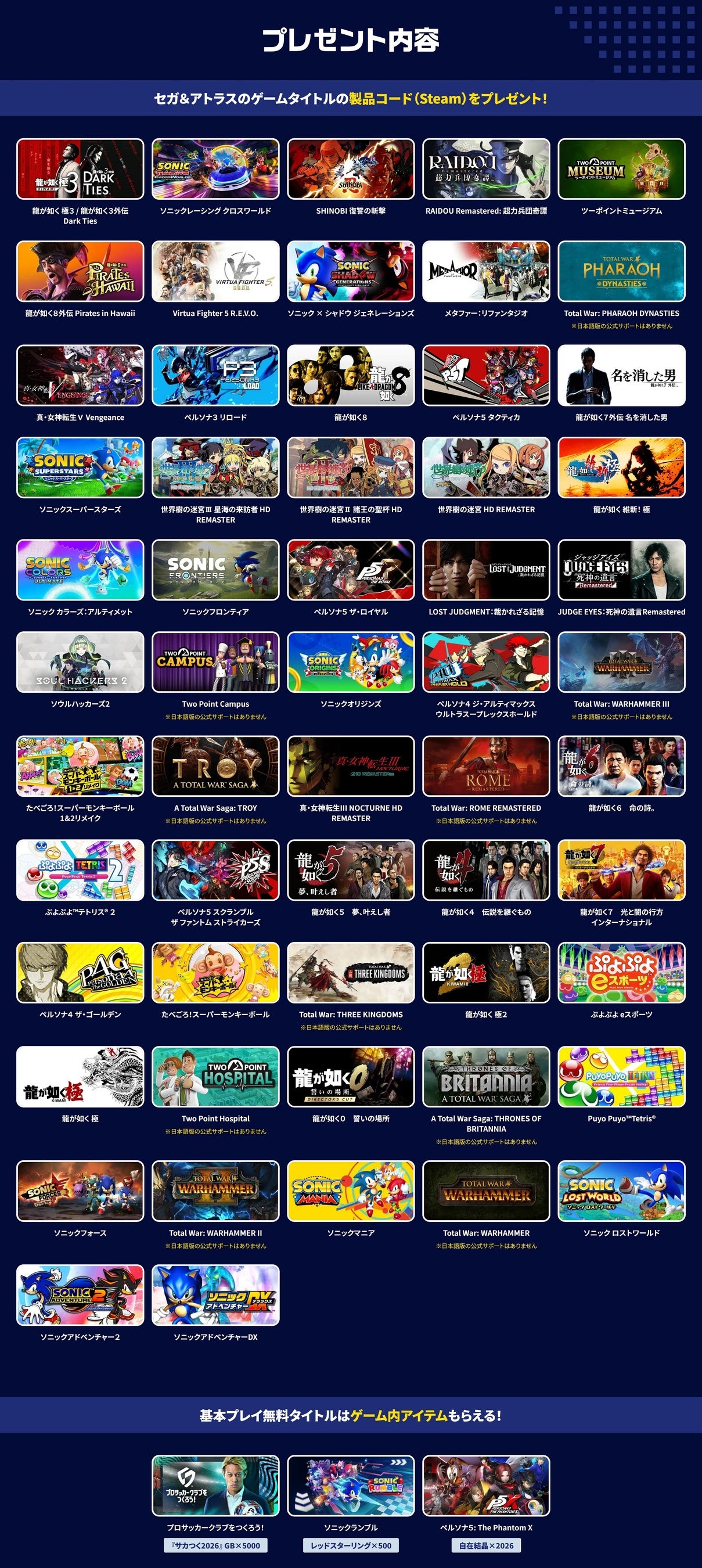 - 対象タイトルのプレイ動画投稿で、セガ/アトラス60タイトルから好きなゲームコードなどをプレゼント。