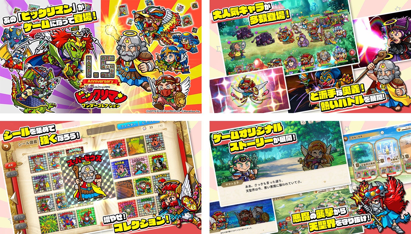ゲームは、ガチャで入手したシールを強化し、オリジナルストーリーを進めるRPG。