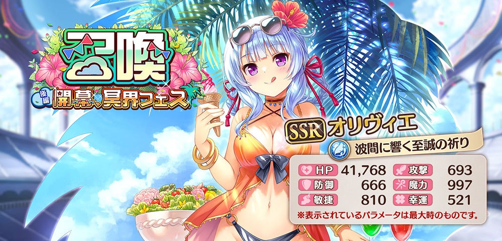 また、期間限定の『開幕、冥界フェス召喚』も開催されており、SSRフリッカ【陽光と戯れる水しぶき】やSSRオリヴィエ【波間に響く至誠の祈り】がピックアップされています。