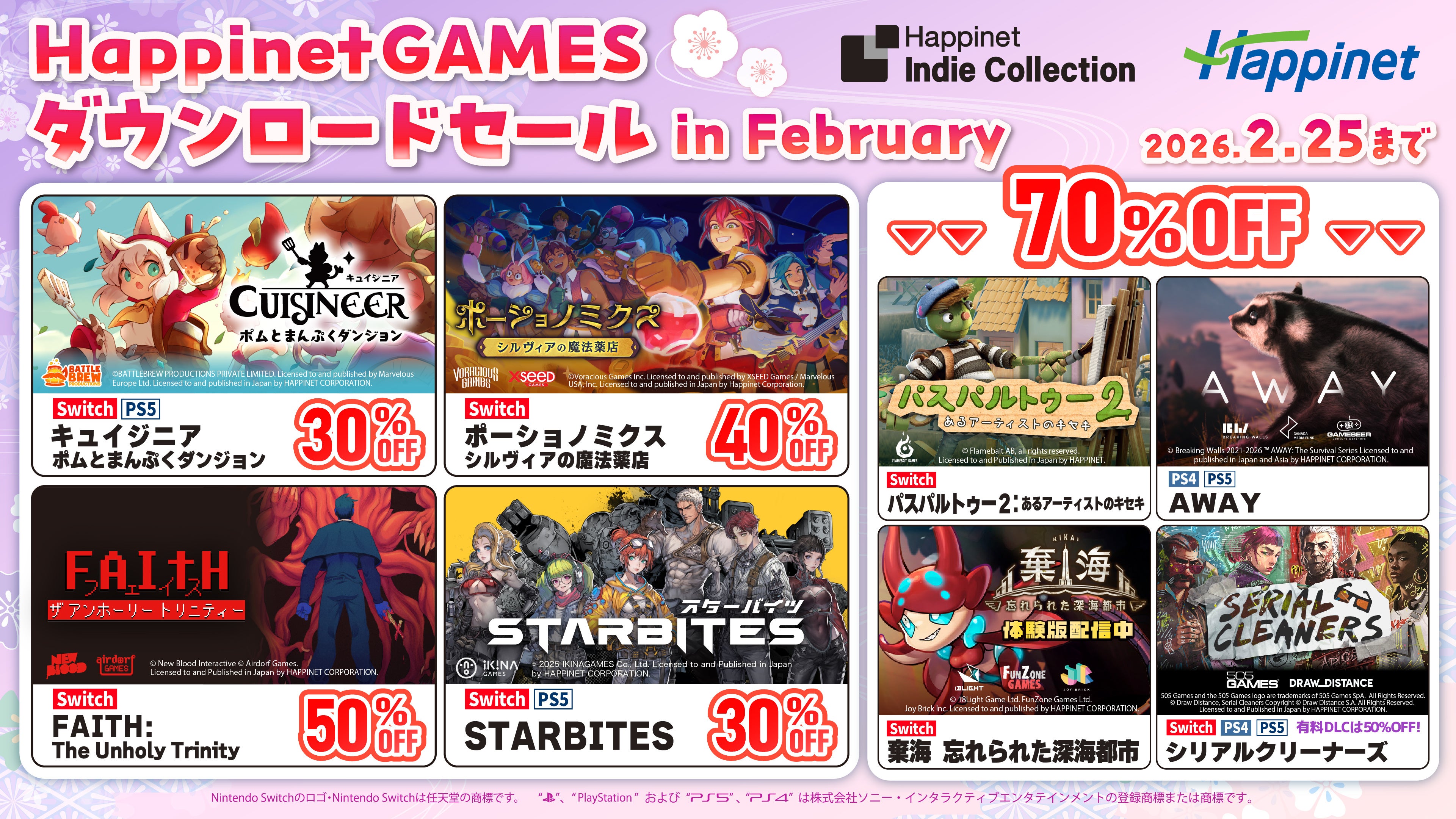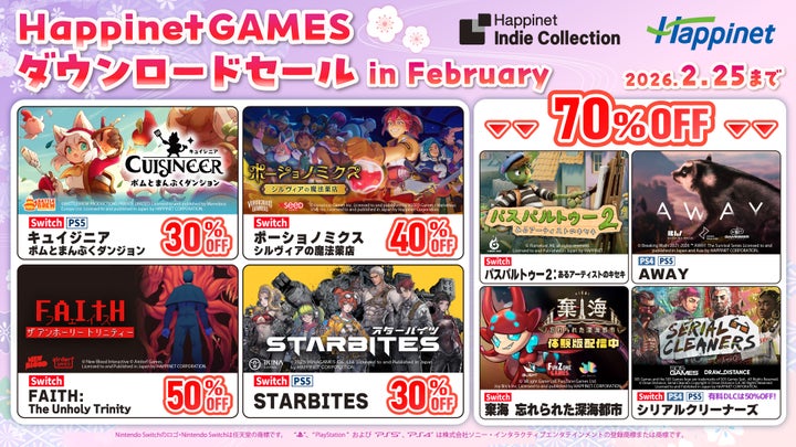 株式会社ハピネットは、自社パブリッシングタイトルがお得に購入できる『HappinetGAMES ダウンロードセール in February』を実施する。