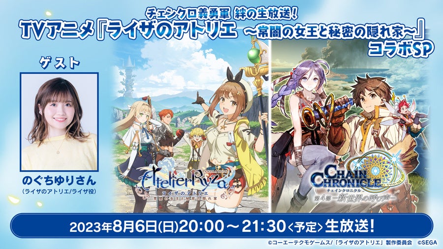 2023年8月8日に、スマートフォン向けのマルチ・チェインシナリオRPG『チェインクロニクル 第4部 ―新世界の呼び声―』とTVアニメ『ライザのアトリエ ~常闇の女王と秘密の隠れ家~』のコラボイベントが開始されます。