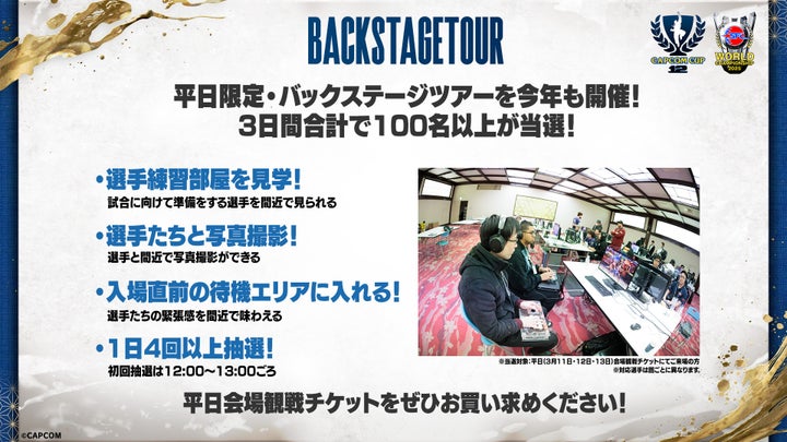 平日には、来場者特典として『ストリートファイター6』のコスチュームプレゼントや、バックステージツアー、オンステージフォトエクスペリエンスなどのイベントも開催される。