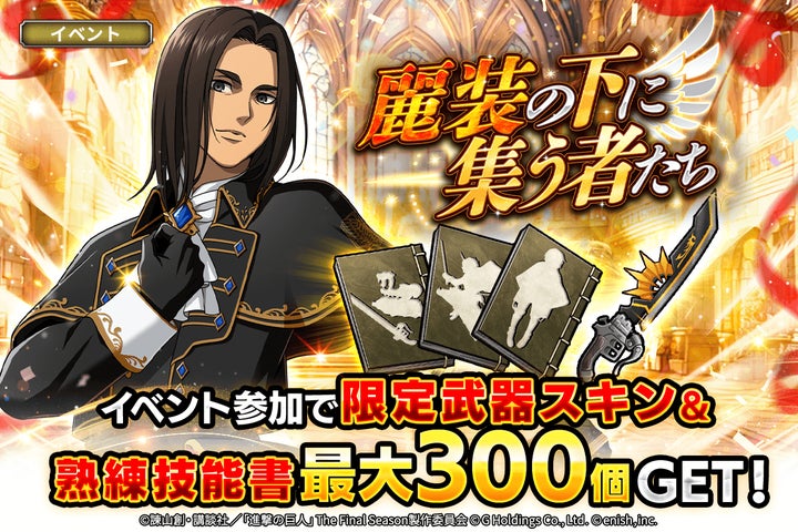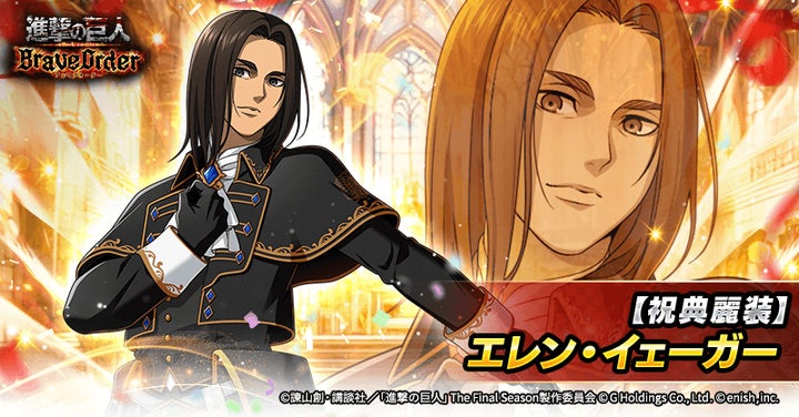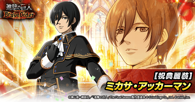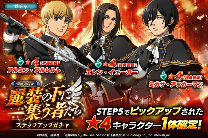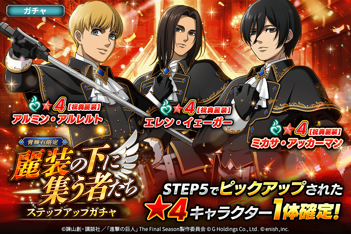 • 新ガチャでは【祝典麗装】ミカサ、アルミン、エレンが登場。育成ブーストや無料デイリーパック配布も実施。