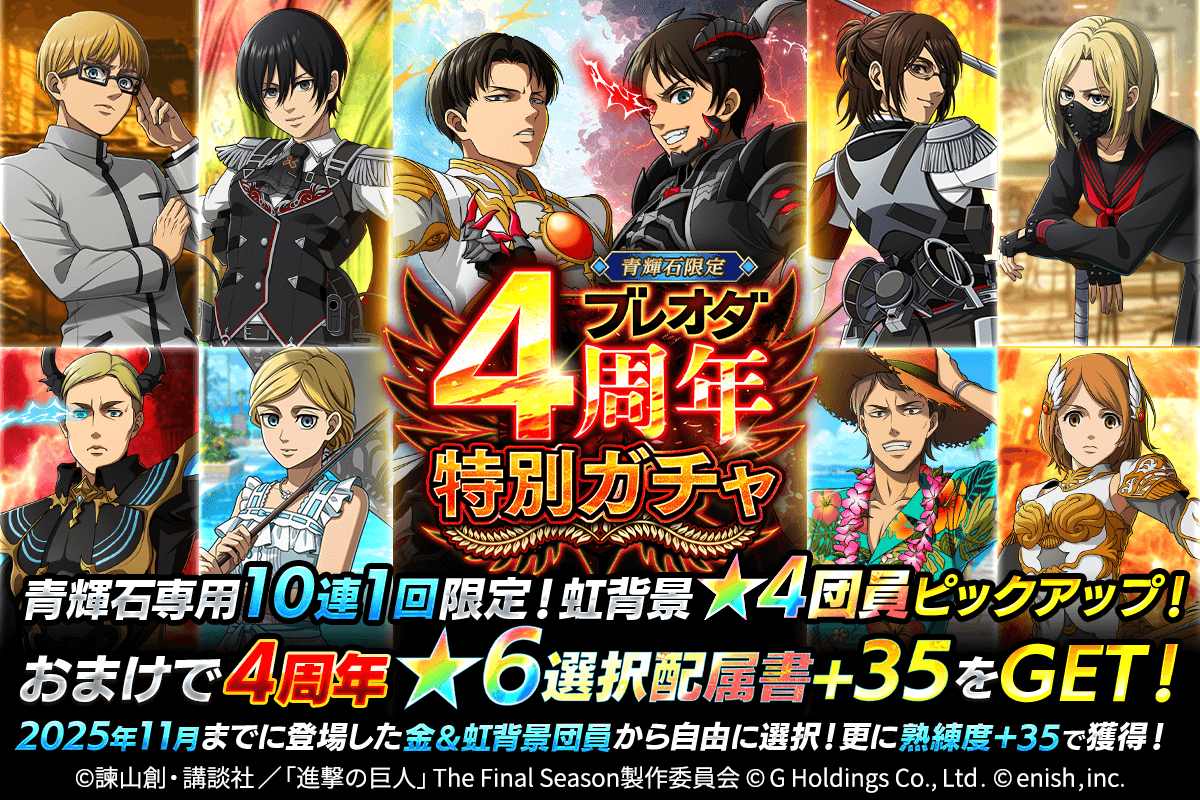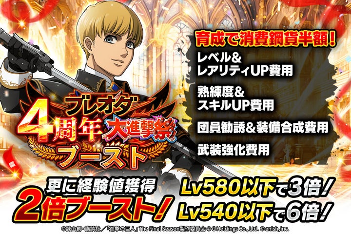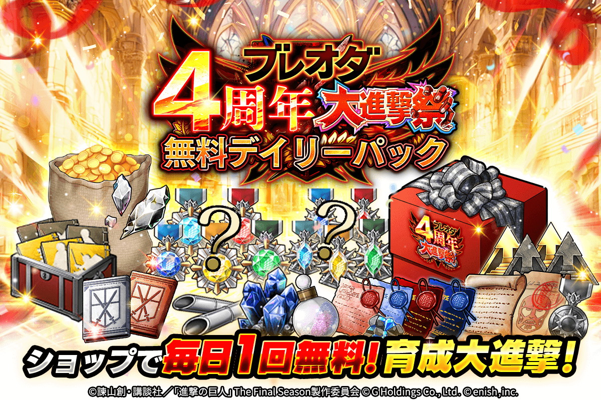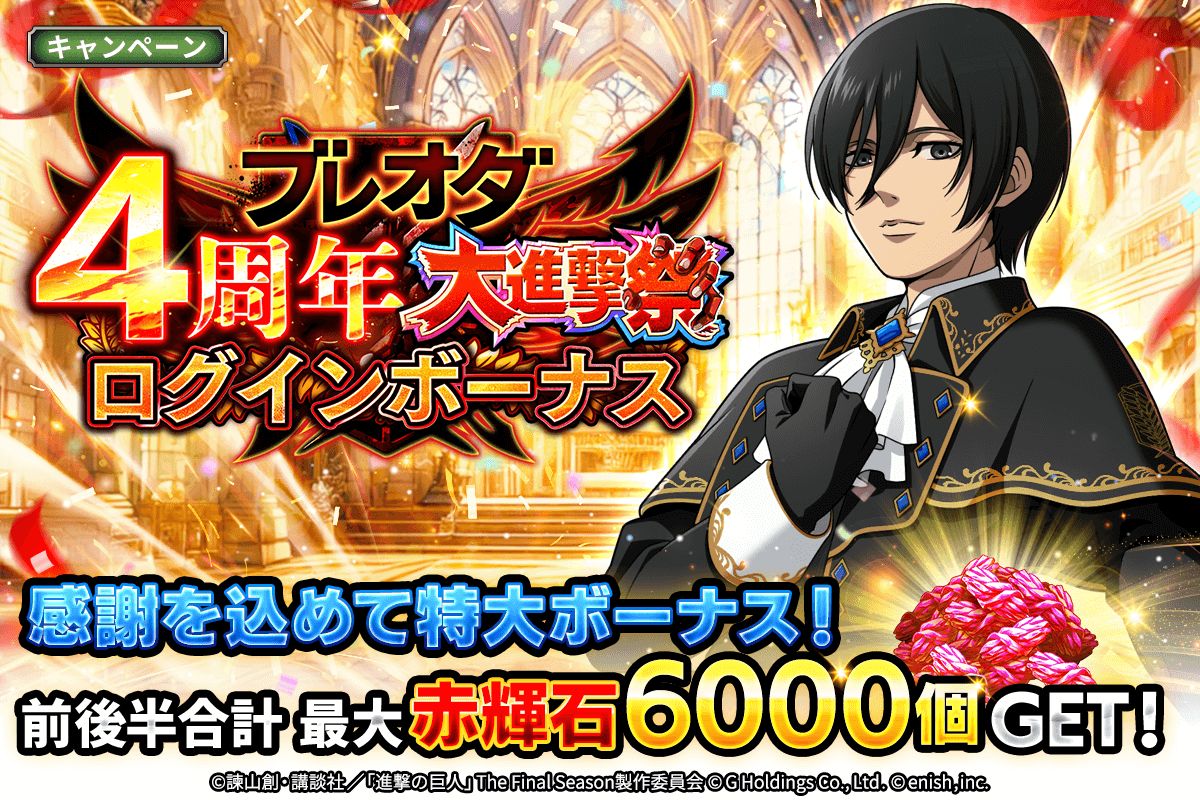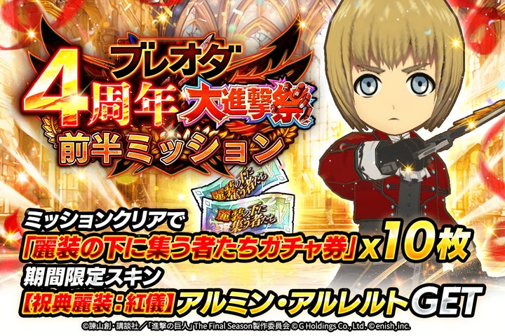 スマートフォンゲーム「進撃の巨人Brave Order」にて、4周年を記念した「ブレオダ4周年大進撃祭」が開催される。
