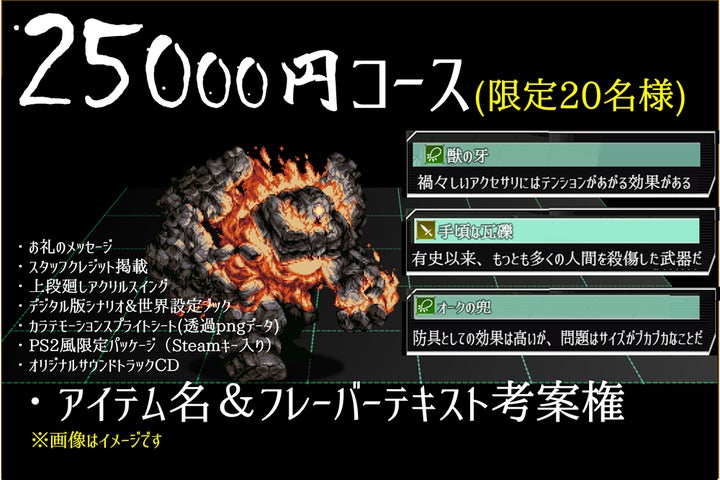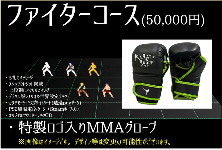 クラウドファンディングでは、本物のMMAグローブ、オリジナルサウンドトラックCD、PS2風限定パッケージ、シナリオ&世界設定ブックなどのリターンを用意。