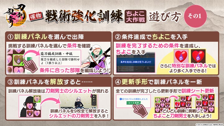 イベントでは、訓練パネルをクリアして「ちよこ」を集め、新刀剣男士や報酬を獲得できます。
