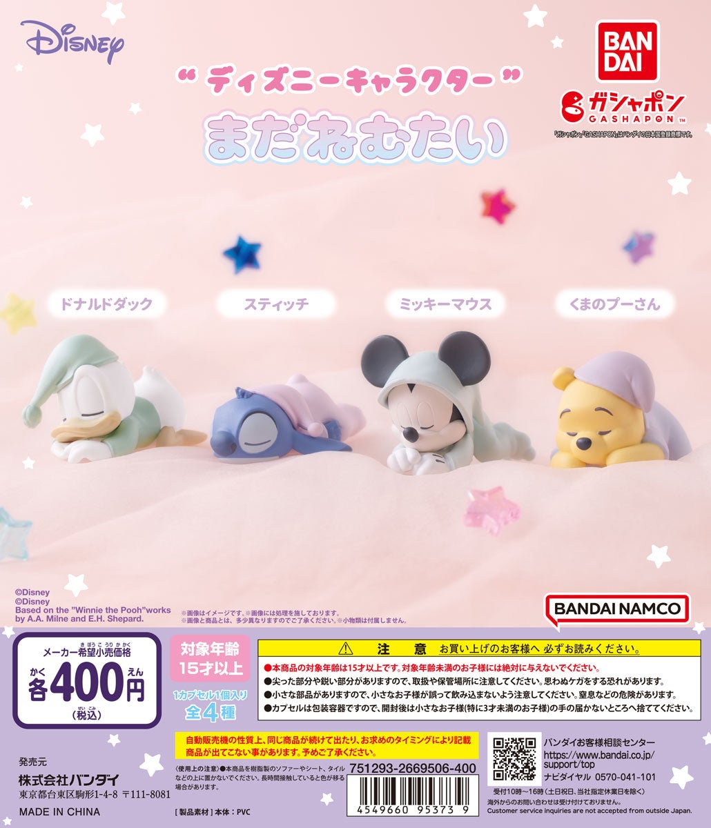 『“ディズニーキャラクター”まだねむたい』は、2023年8月第2週から全国のガシャポンバンダイオフィシャルショップや玩具売場などで販売されます。