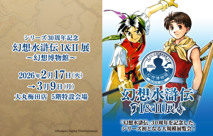 大丸梅田店5階にて、2026年2月17日から3月9日まで「幻想水滸伝」シリーズ30周年を記念した大規模展覧会『シリーズ30周年記念 幻想水滸伝I&II展 〜幻想博物館〜』が開催されます。
