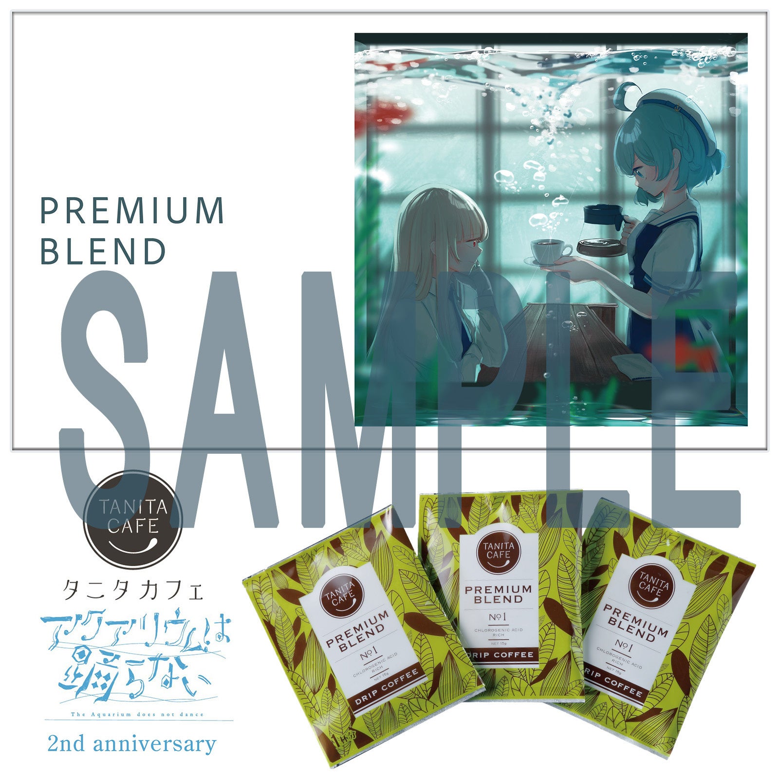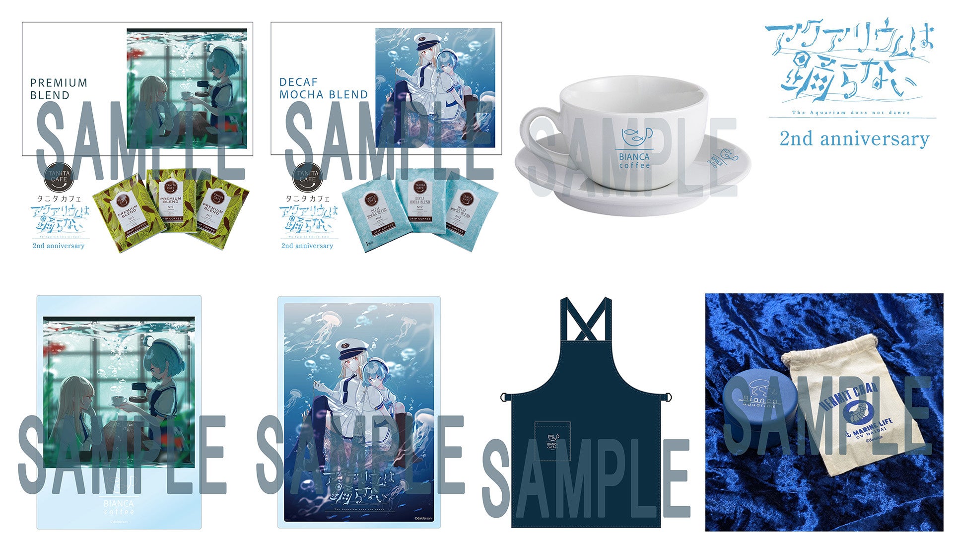 橙々氏の既存イラストを使用したアイテムに加え、作中に登場するビアンカ水族館のカフェをモチーフにしたグッズ、タニタコーヒーとのコラボコーヒーなどが登場。