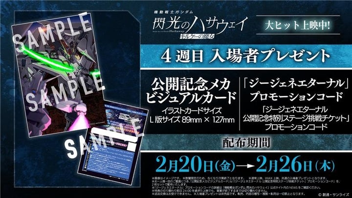- 『機動戦士ガンダム 閃光のハサウェイ キルケーの魔女』4週目入場者プレゼントとして、メカビジュアルカードと「ジージェネエターナル」のプロモーションコードを配布。