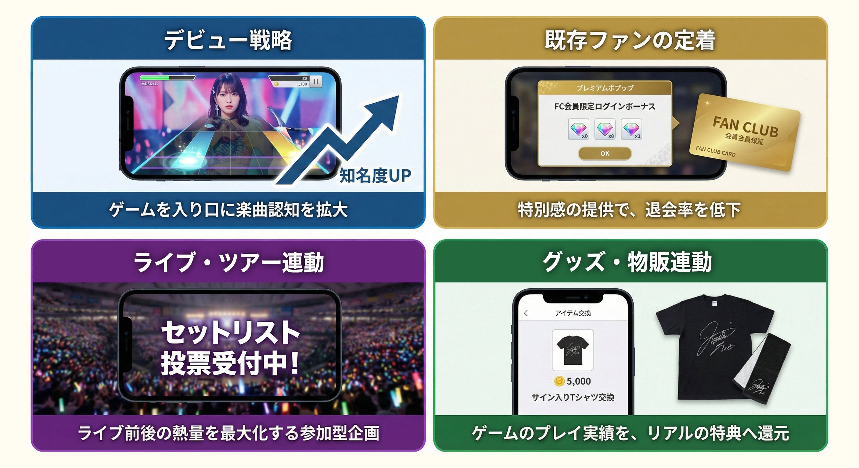 - 季節・イベント連動のゲーム内キャンペーン、新曲リリースに合わせた限定ガチャ・ストーリー追加など、長期的な関係構築を支援。