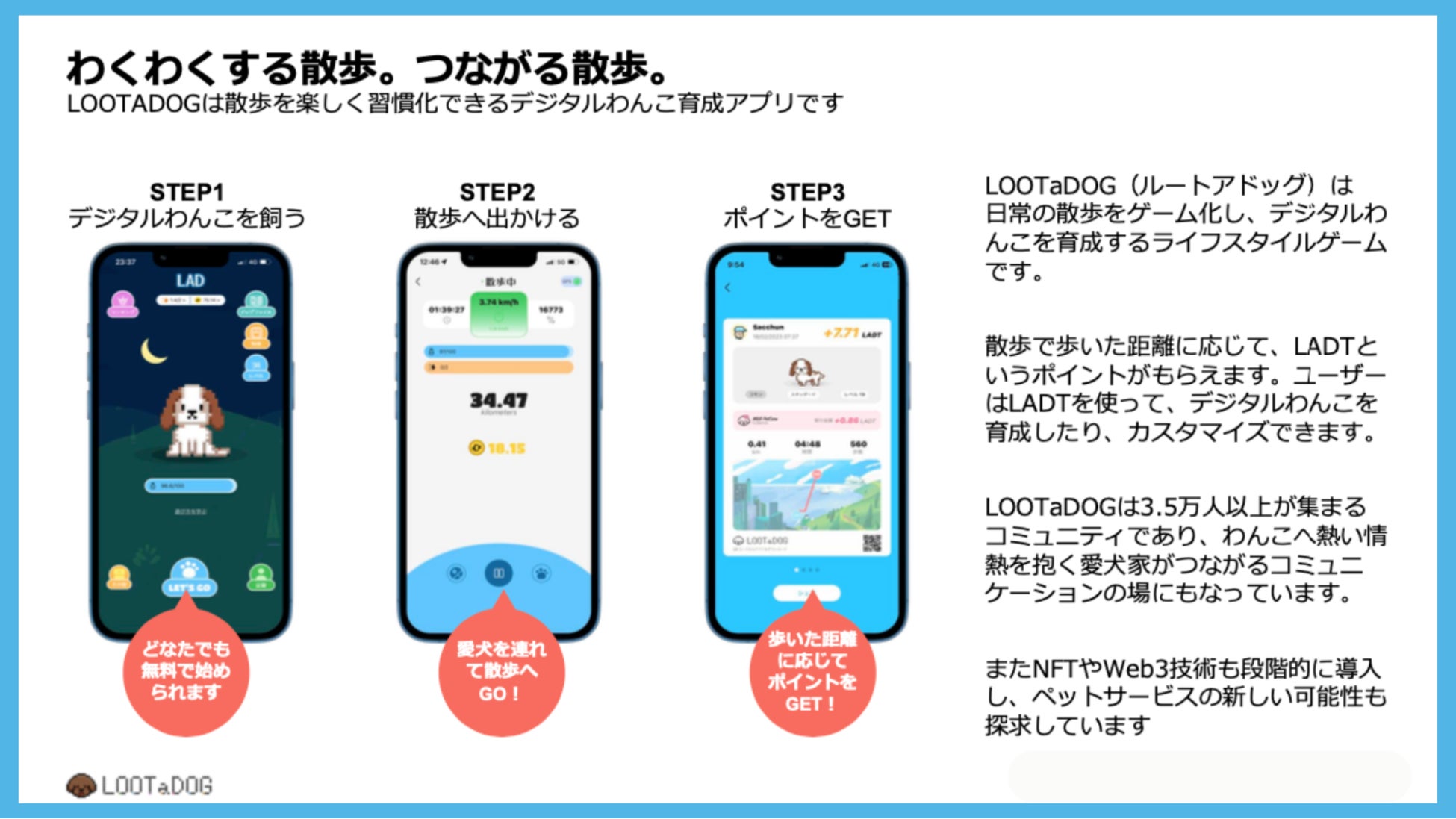 LOOTaDOGは日常の散歩をゲーム化し、Web3わんこ育成を楽しむことができるアプリで、ワンちゃんとの生活を豊かにすることを目指しています。