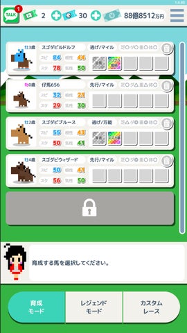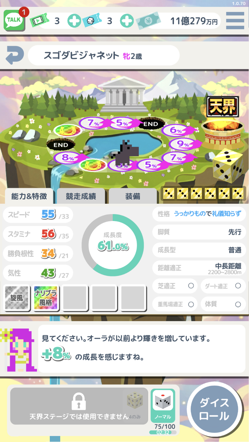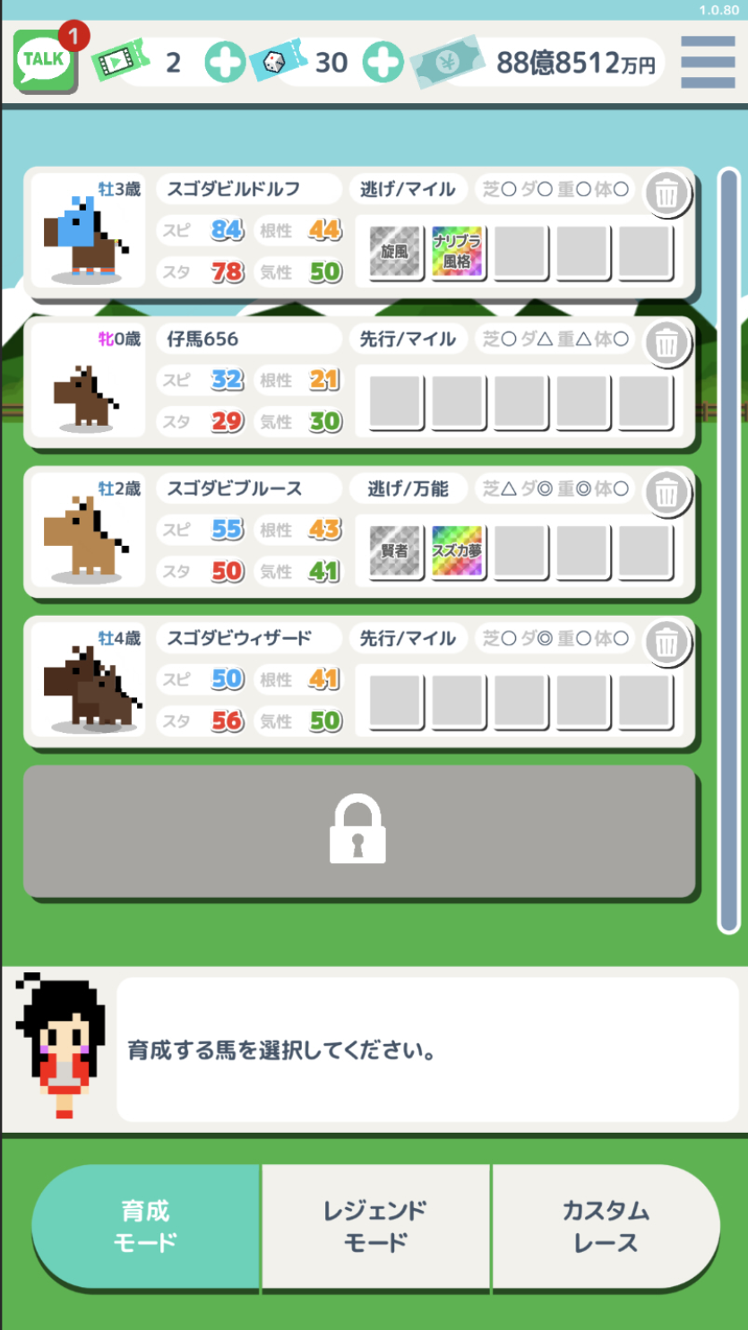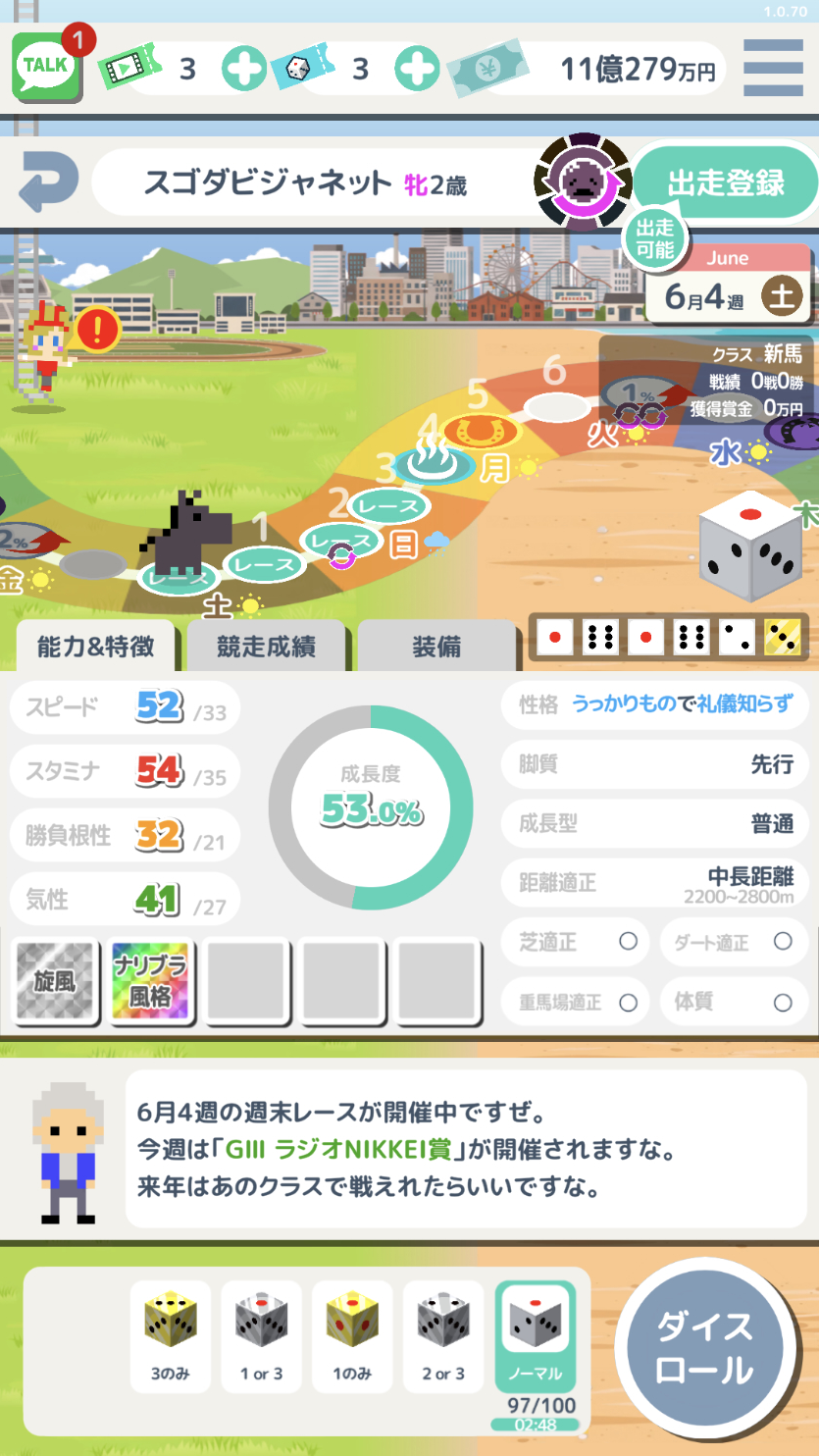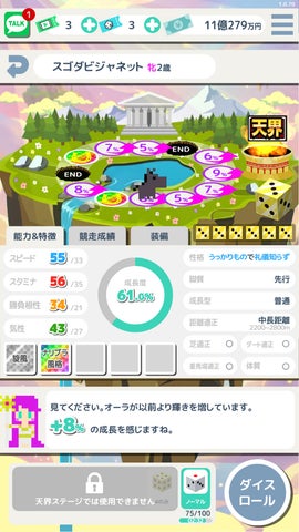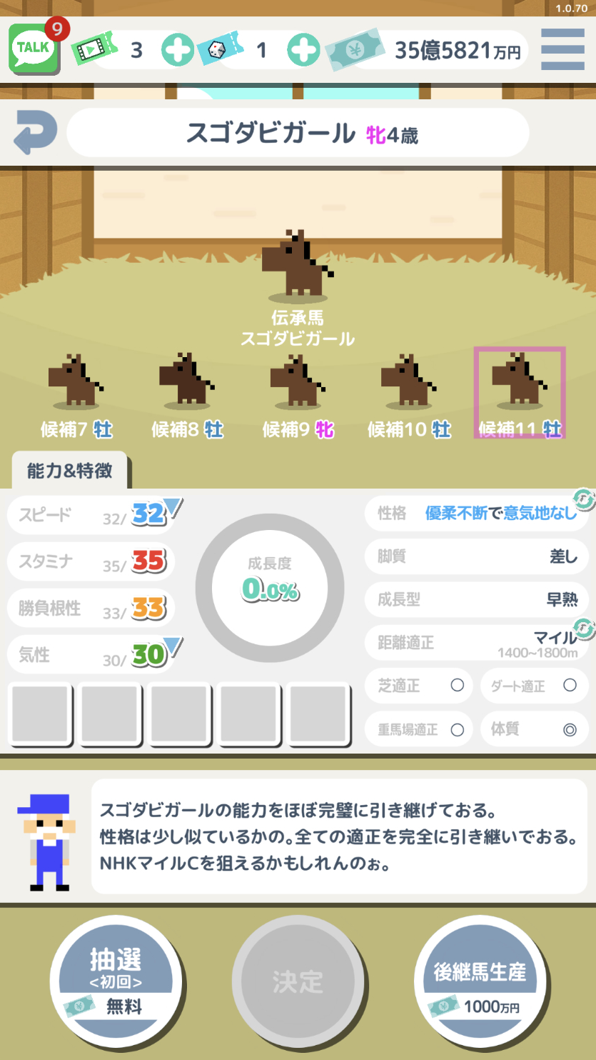 - ガチャや配合を廃止し、厳選と継承で馬を育成。スゴロク形式の育成やハクスラ要素も。