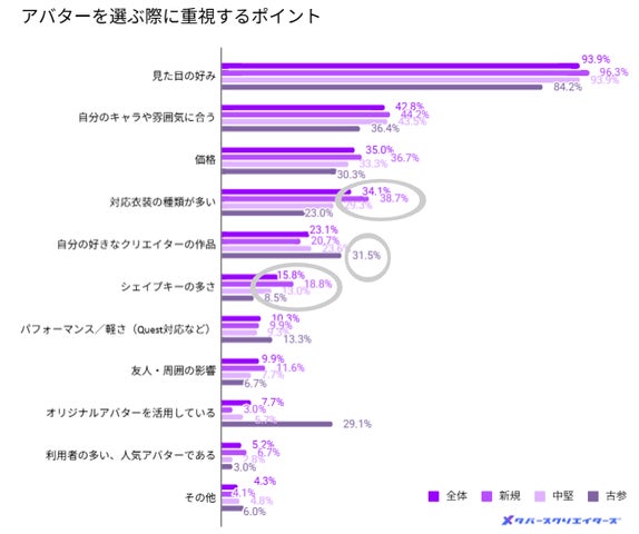 また、新規層はアバターの改変のしやすさを重視する傾向が強く、所持アバター数や性別にも違いが見られました。