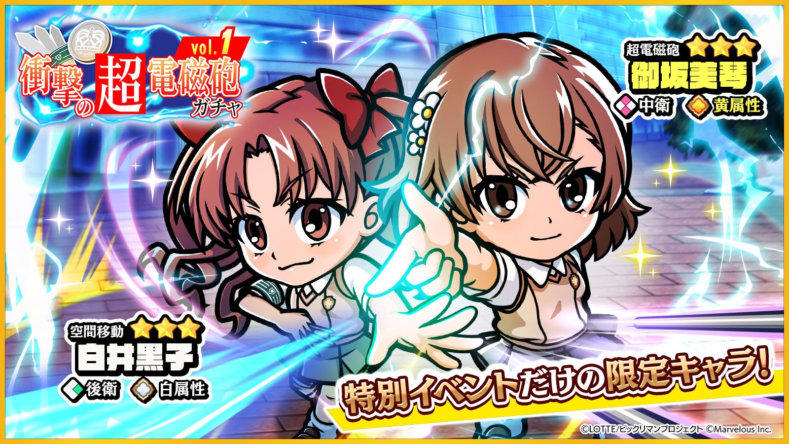 特別ガチャ「衝撃の超電磁砲ガチャ Vol.1」では、[超電磁砲]御坂美琴と[空間移動]白井黒子が登場し、排出率がアップ。