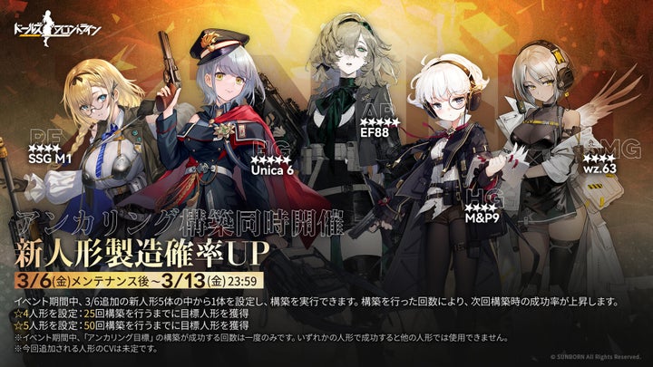 - 3月6日(金)より、新人形5名が追加され、製造確率UPイベントが開催される。
