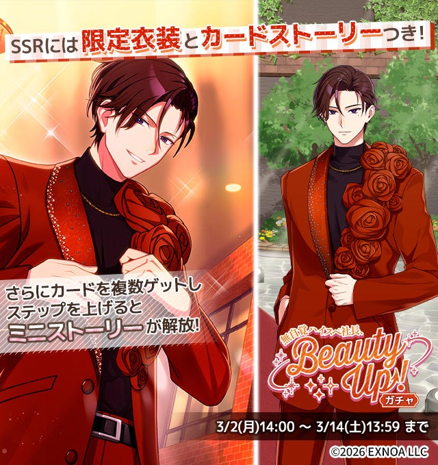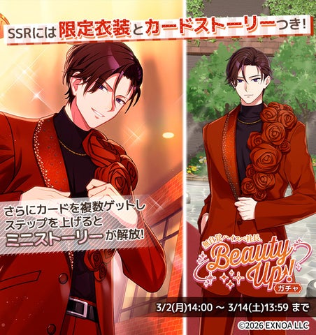 また、イベントに合わせて期間限定のガチャも開催され、「SSR【ビューティーアップ】鷹宏」と「SR【ビューティーアップ】凌弥」が登場する。