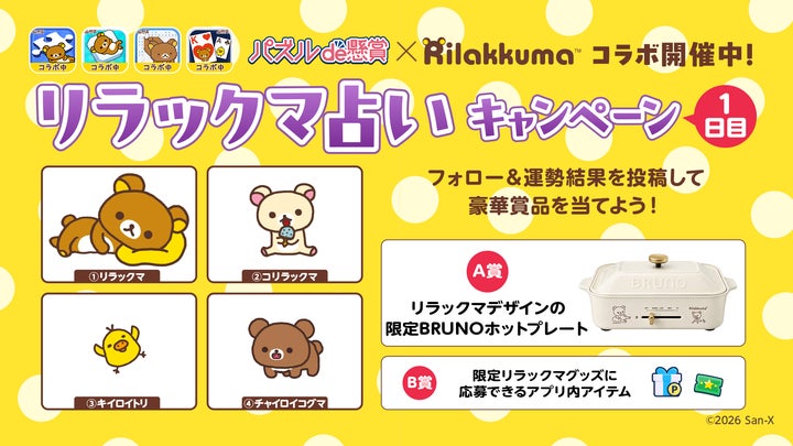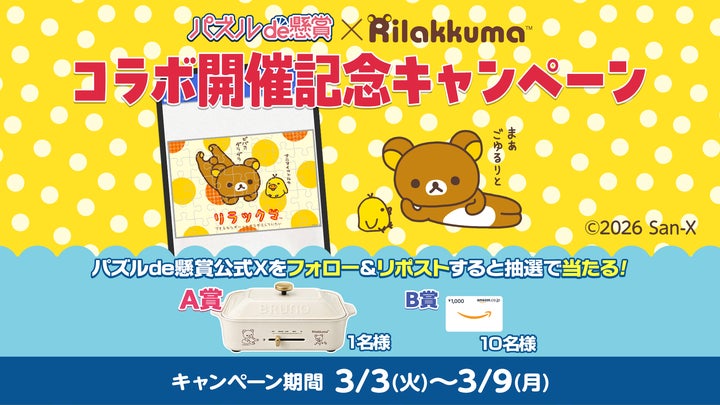 累計1,900万ダウンロードを突破したパズルde懸賞シリーズが、人気キャラクター「リラックマ」とのコラボイベントを2026年3月3日(火)より4アプリ同時開催。