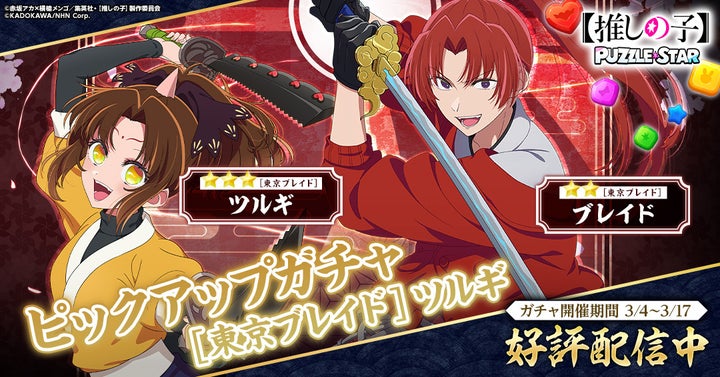 TVアニメ『【推しの子】』初の公式パズルゲーム『【推しの子】Puzzle Star』にて、3月4日(水)よりピックアップガチャ[東京ブレイド]が開催される。