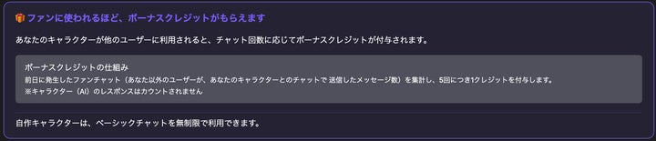 また、クリエイター向けの仕組みも用意されており、自作チャットの利用状況に応じてボーナスを獲得できます。