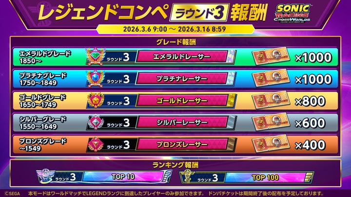 - 『ソニックレーシング クロスワールド』で「レジェンドコンペ ラウンド3」が開催。