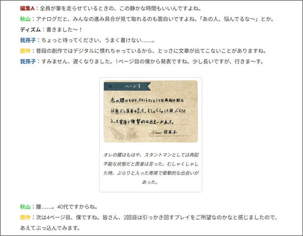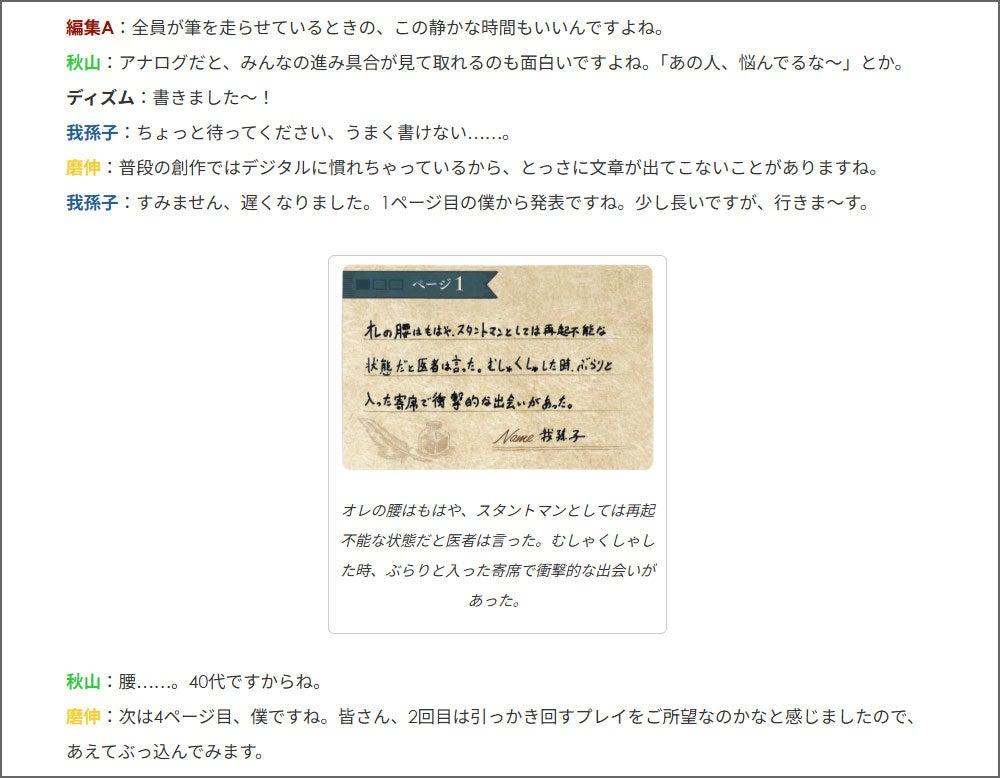 プレイヤーは、バラバラな順番でページに書き込み、予想外の展開や伏線回収を楽しむことができます。