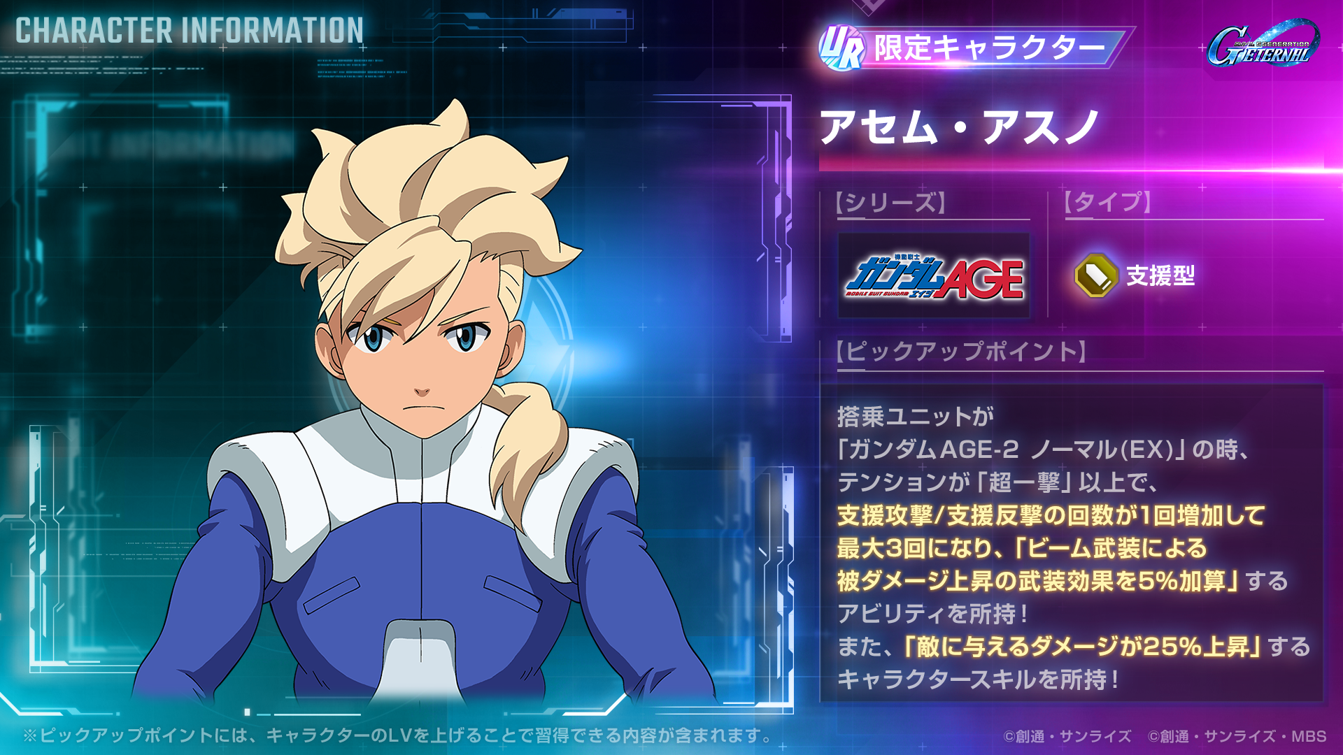 - UR「ガンダムAGE-2 ノーマル(EX)」/UR 「アセム・アスノ」などが登場するピックアップガシャも開催。