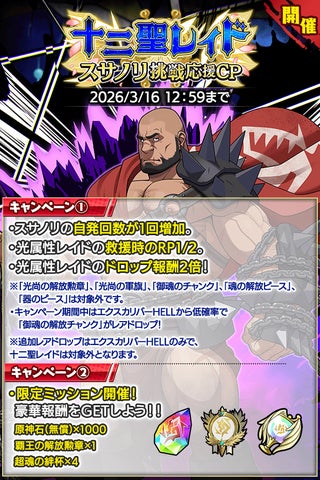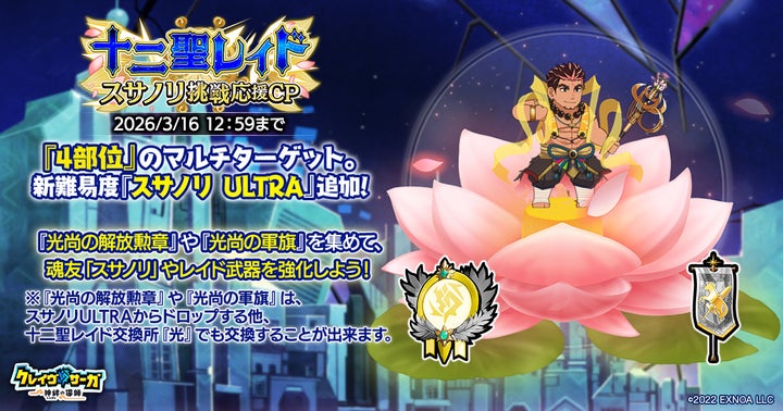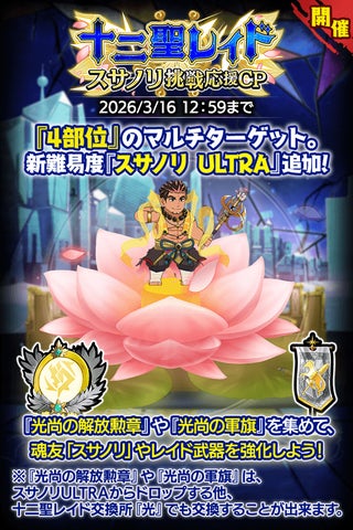 - 『クレイヴ・サーガ 神絆の導師』にて「十二聖レイド スサノリ挑戦応援キャンペーン」が開催。