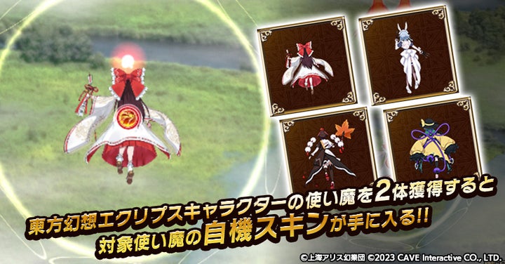 コラボ記念として、東方幻想エクリプスの特定のキャラクター使い魔を2体獲得すると、対象キャラクターの自機スキンが手に入る。