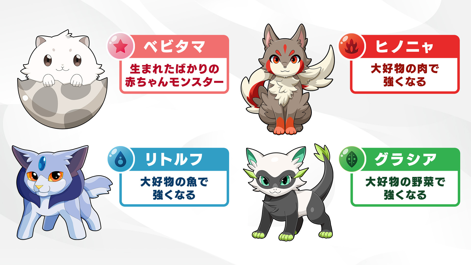 - 食事写真のAI解析結果でモンスターが成長し、食材カードを使ったバトルが楽しめる。