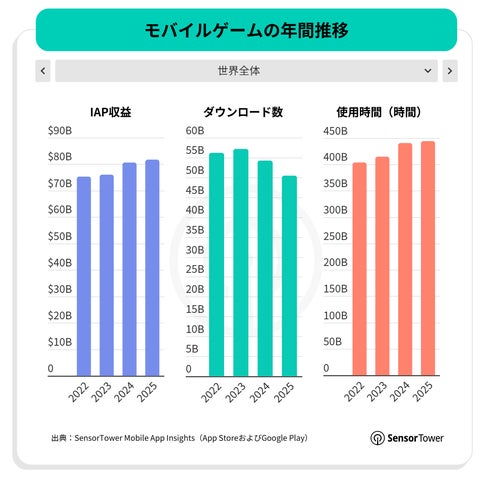 2025年のモバイルゲームダウンロード数は520億、App StoreのIAP収益は75%高い。