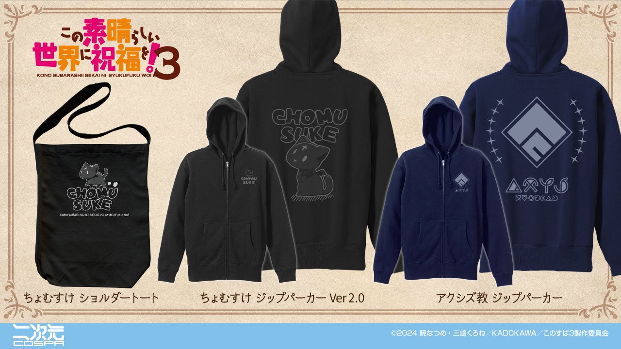 アクア様を愛でるための「アクシズ教 ジップパーカー」と「ちょむすけ ショルダートート」などが登場します。