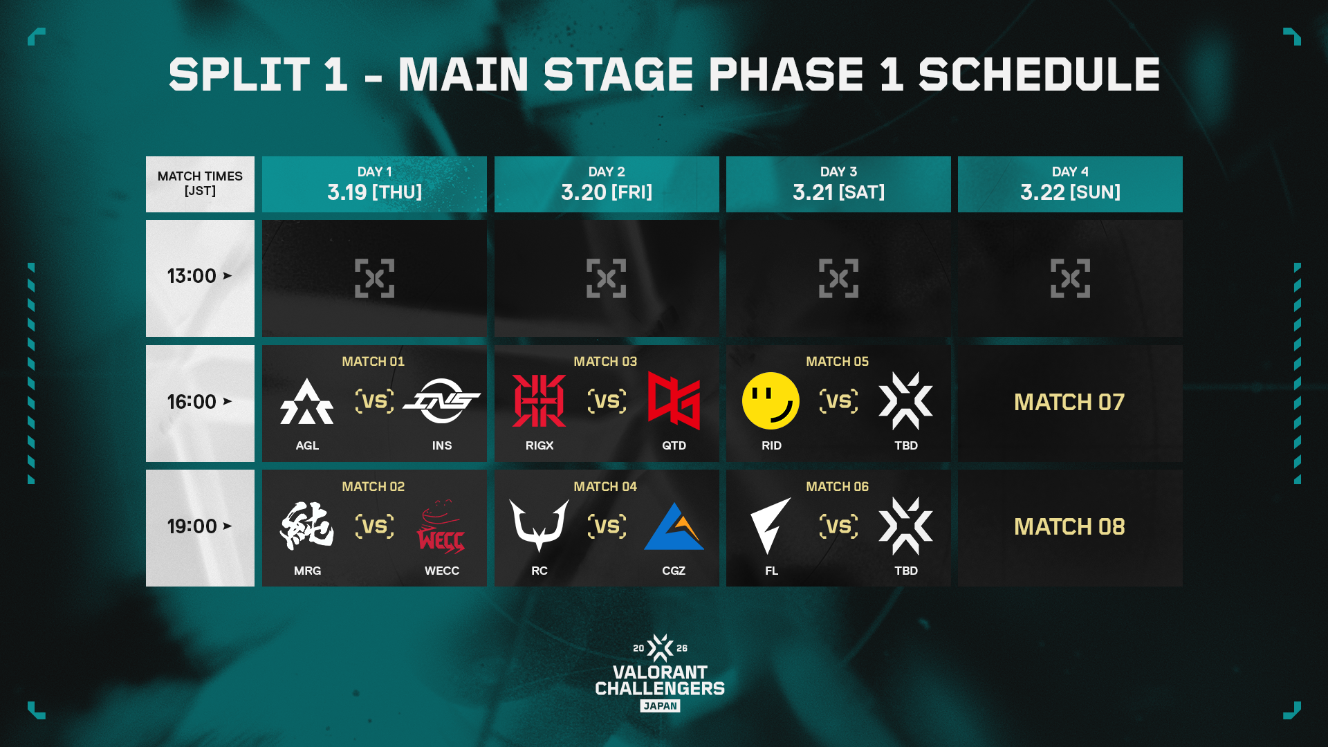 - VALORANT Challengers Japan 2026 Split 1 Main Stage Phase 1が3月19日(木)に開幕。