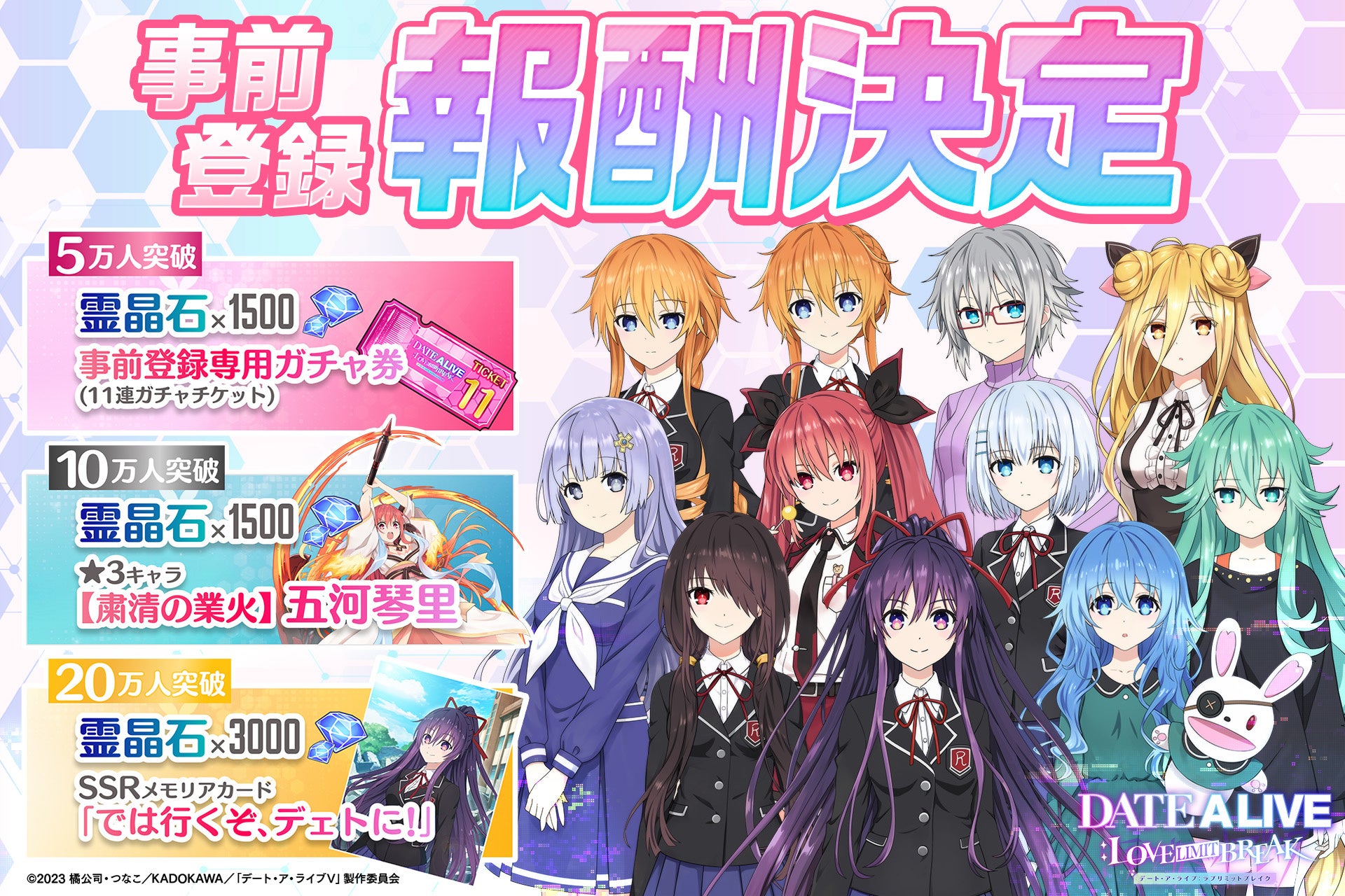事前登録キャンペーンの報酬として、霊晶石6,000個、11連ガチャチケット、★3キャラクター「五河琴里」、SSRメモリアカード「では行くぞ、デェトに!」が配布されます。