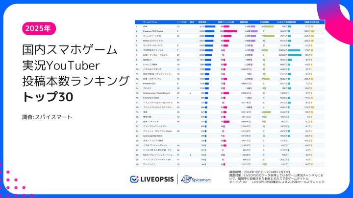株式会社スパイスマートは、LIVEOPSISのデータに基づき、2025年の国内スマホゲーム実況YouTuberの動画動向を分析。