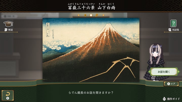 パズルを解いてドット絵アートを完成させ、らでん館長の解説も楽しめます。