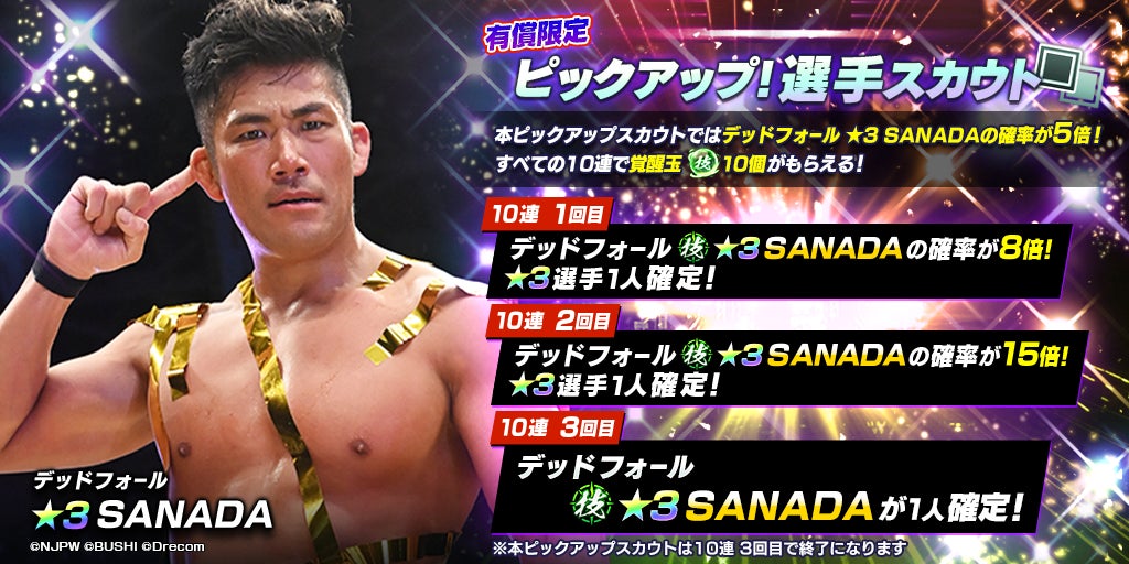 株式会社ブシロードと株式会社ドリコムが共同開発したスマートフォンゲームアプリ『新日本プロレスSTRONG SPIRITS』(以下、新日SS)に、新たな育成選手として★3「[デッドフォール]SANADA」が追加されました。