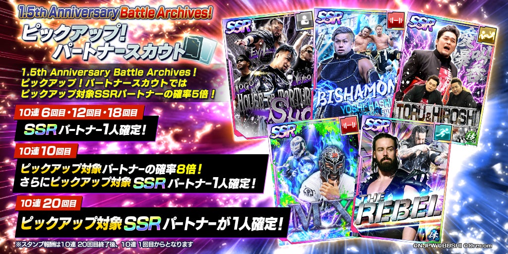 さらに、新日SSの1.5周年を祝して、過去に登場したBattle Archives!のパートナーが出現するピックアップパートナースカウトも開催されています。