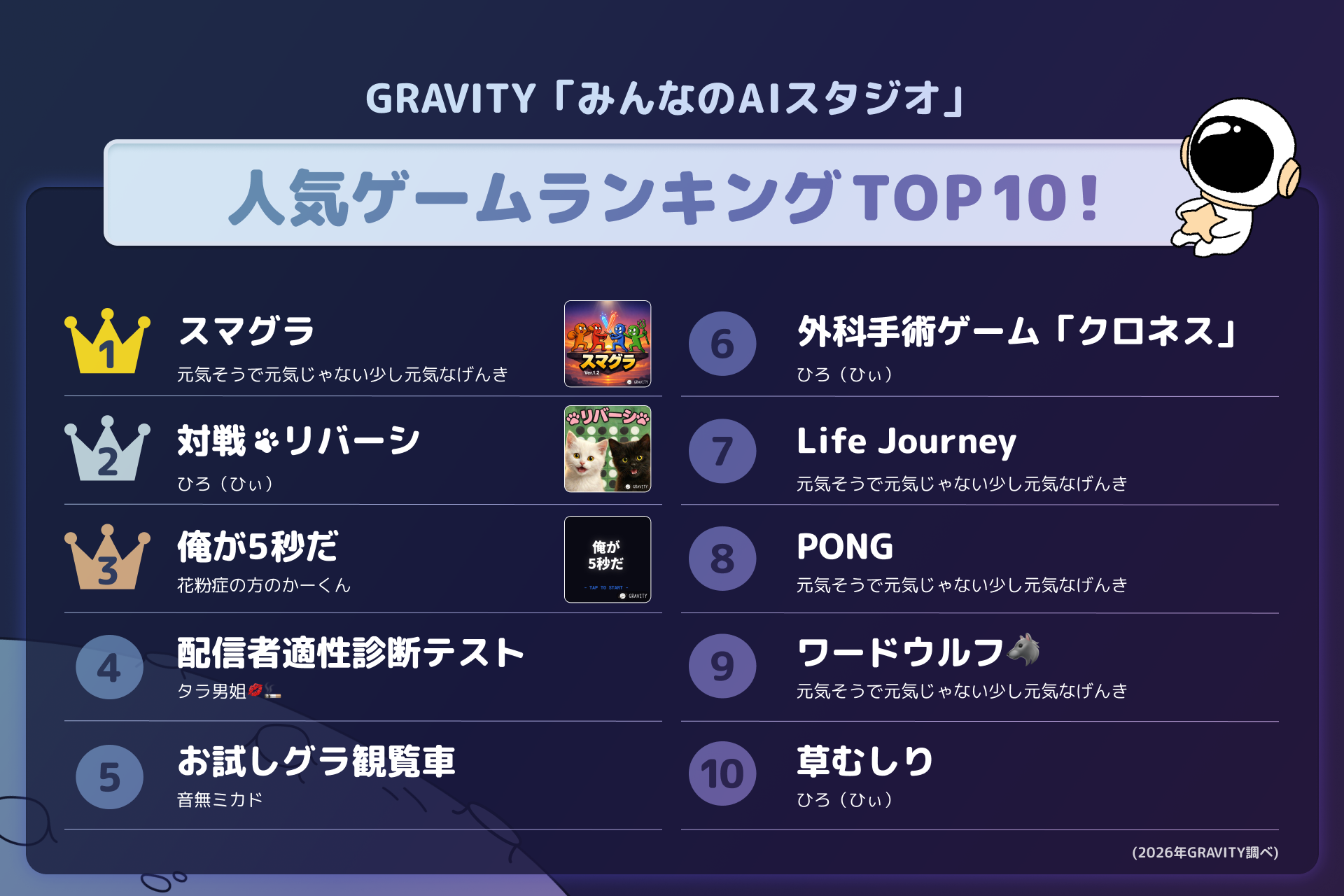 - GRAVITYの「Game Creator」機能で、ユーザー制作AIゲームの人気ランキングTOP10を発表。