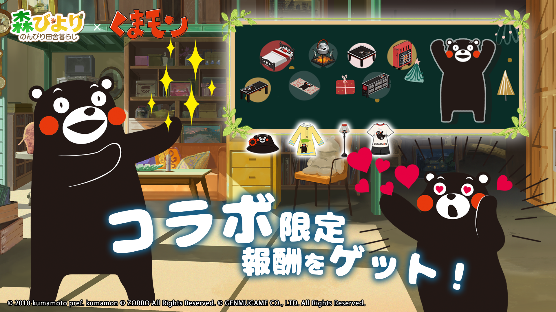 株式会社幻夢ゲームが配信する生活シミュレーションゲーム『森びより – のんびり田舎暮らし』が、3月31日より熊本県のPRキャラクター「くまモン」とのコラボを実施します。