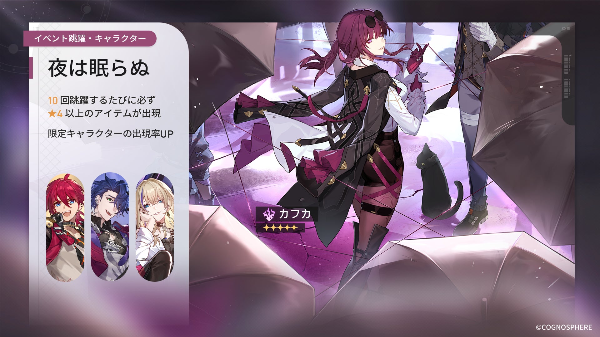 このイベントでは、限定星5キャラクター「カフカ」(CV:伊藤静)と新星4キャラクター「ルカ」(CV:梶原岳人)が登場します。