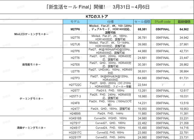 KTCのゲーミングモニターブランド「KTC」が、新生活応援セール「新生活セール Final」を2026年3月31日(火)から4月6日(月)まで開催する。