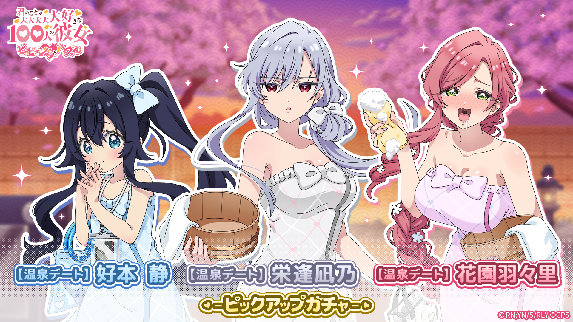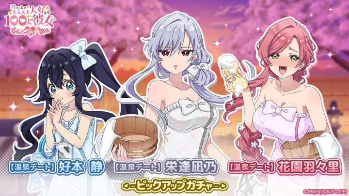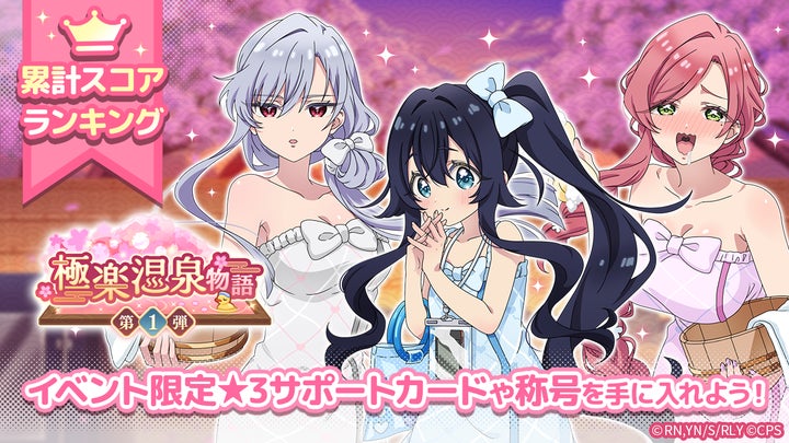 さらに、温泉デート衣装の好本 静、栄逢凪乃、花園羽々里が登場するピックアップガチャや、イベントマップでポイントを集めて報酬を獲得できる「極楽温泉物語 第1弾」も開催される。