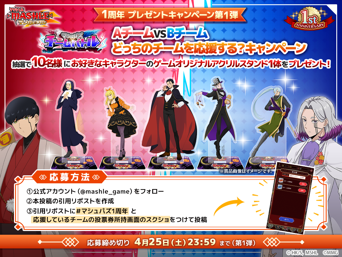 4月29日(水)からは、ミニストーリーイベント『1周年記念』や、1周年記念ガチャとして『マシュパズチームバトル Aチームガチャ』、『マシュパズチームバトル Bチームガチャ』を開催。