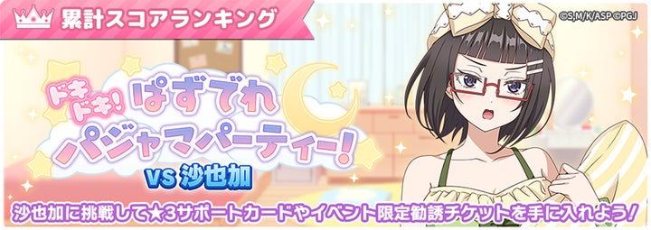 4月3日(金)からは累計スコアランキングイベント「ドキドキ!ぱずでれパジャマパーティー! VS沙也加」が開催され、特効キャラを編成すると有利に進められる。