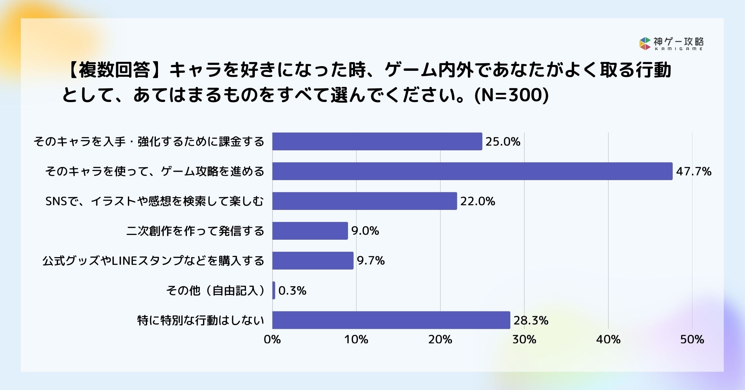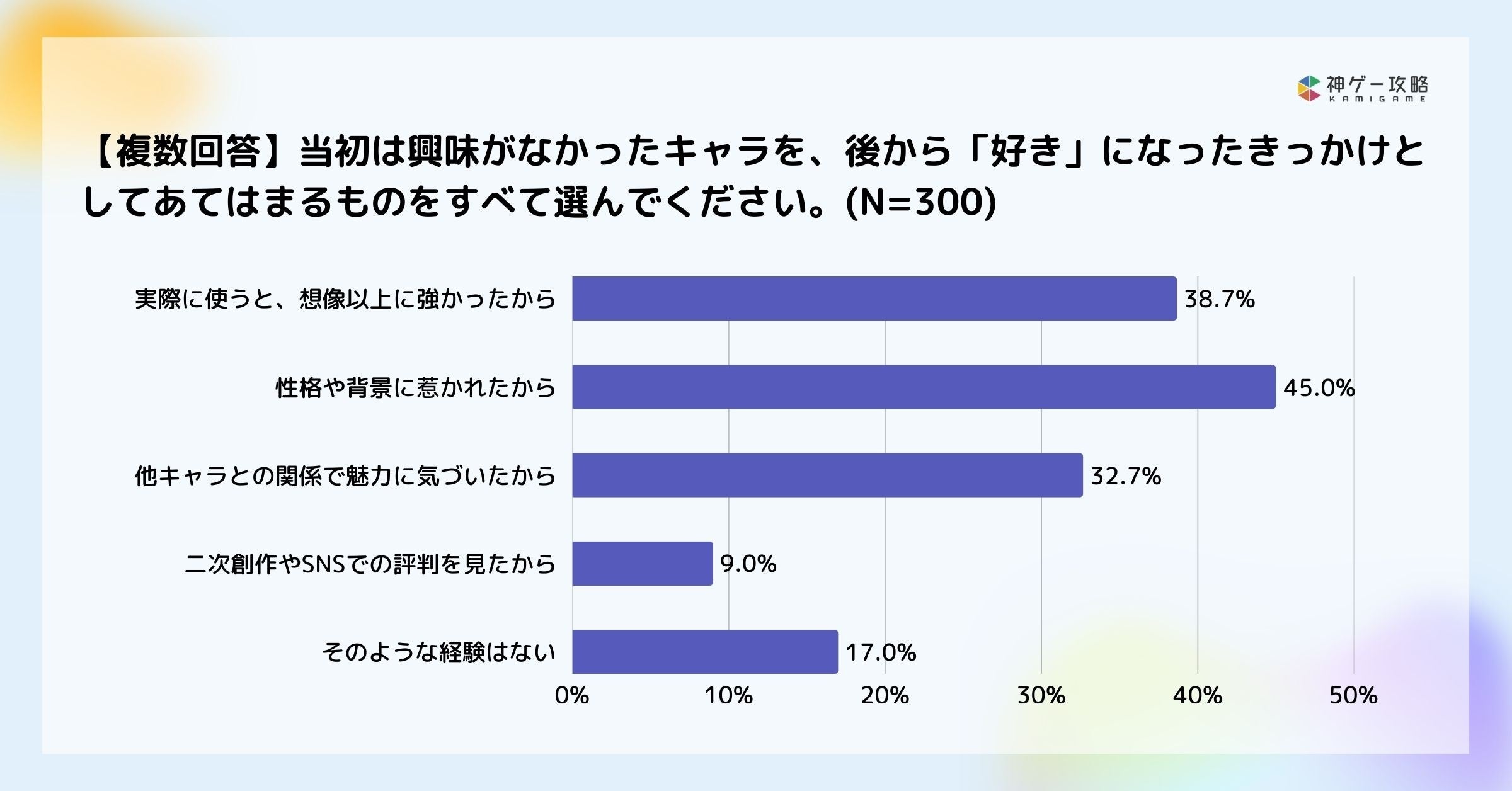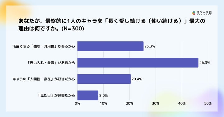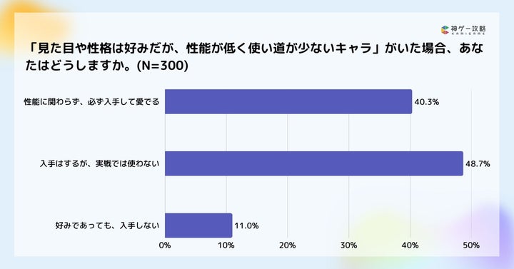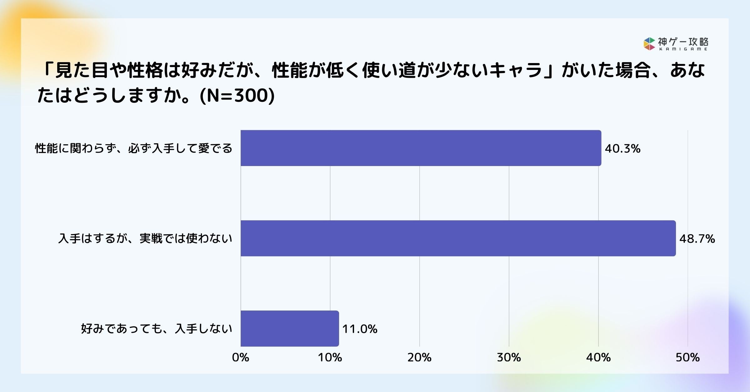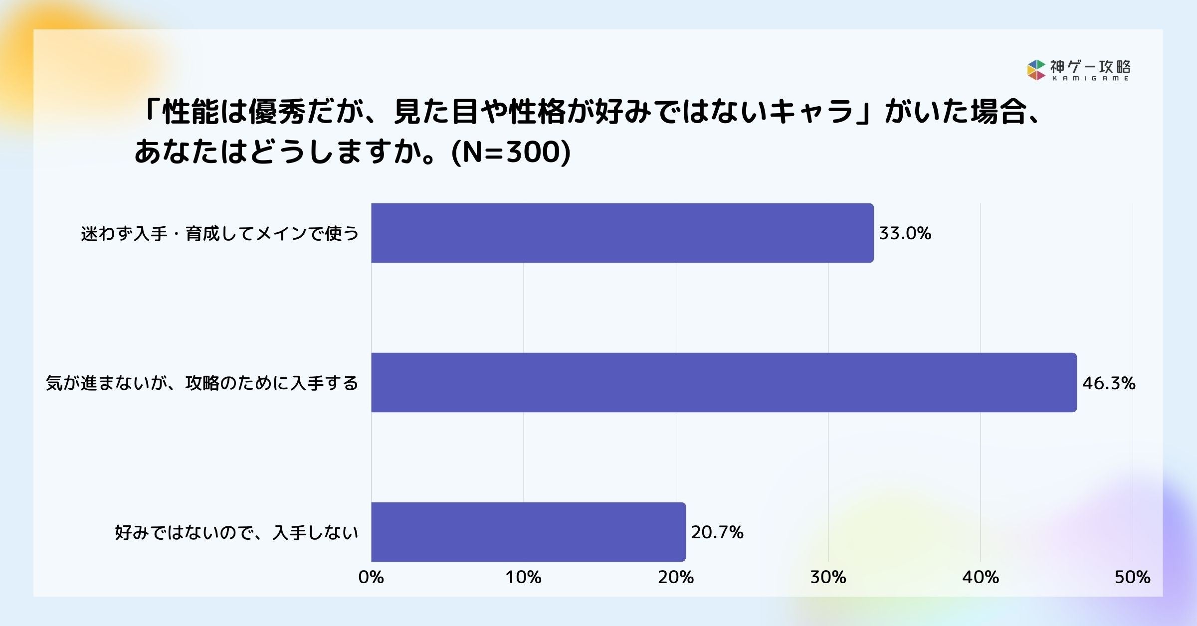 性能が低くても、見た目が好みであれば入手するユーザーも多い一方で、性格が合わないキャラクターは好きになりにくいという結果も出ています。