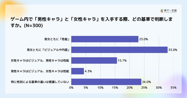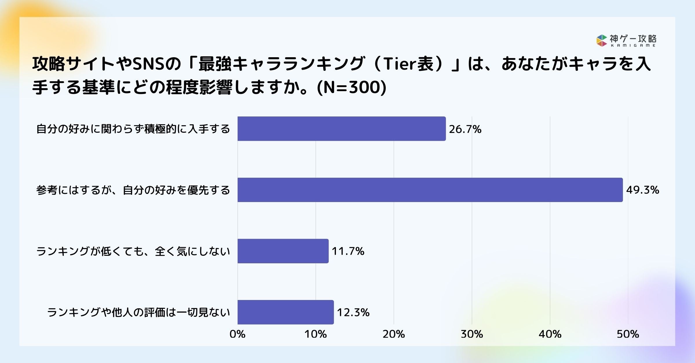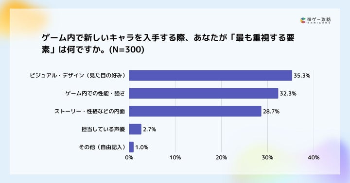 新しいキャラクターを入手する際に最も重視する要素は「ビジュアル・デザイン(見た目の好み)」で35.3%を占め、攻略サイトのランキングは参考にするものの、自分の好みを優先する傾向が見られました。